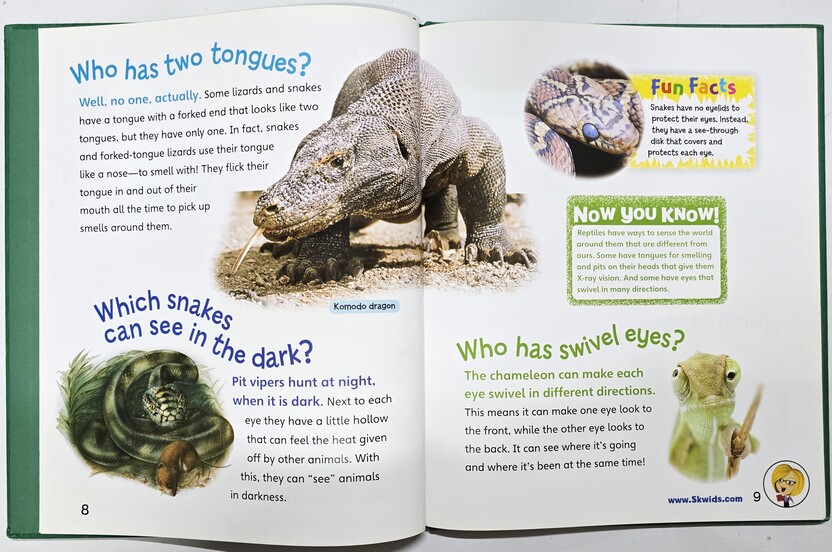 Simple questions with simple answers: Why do lizards lose their skin? Which reptile has eyes that swivel? Why do turkeys gobble? Who has 2 tongues? Which snakes see in the dark? and more!