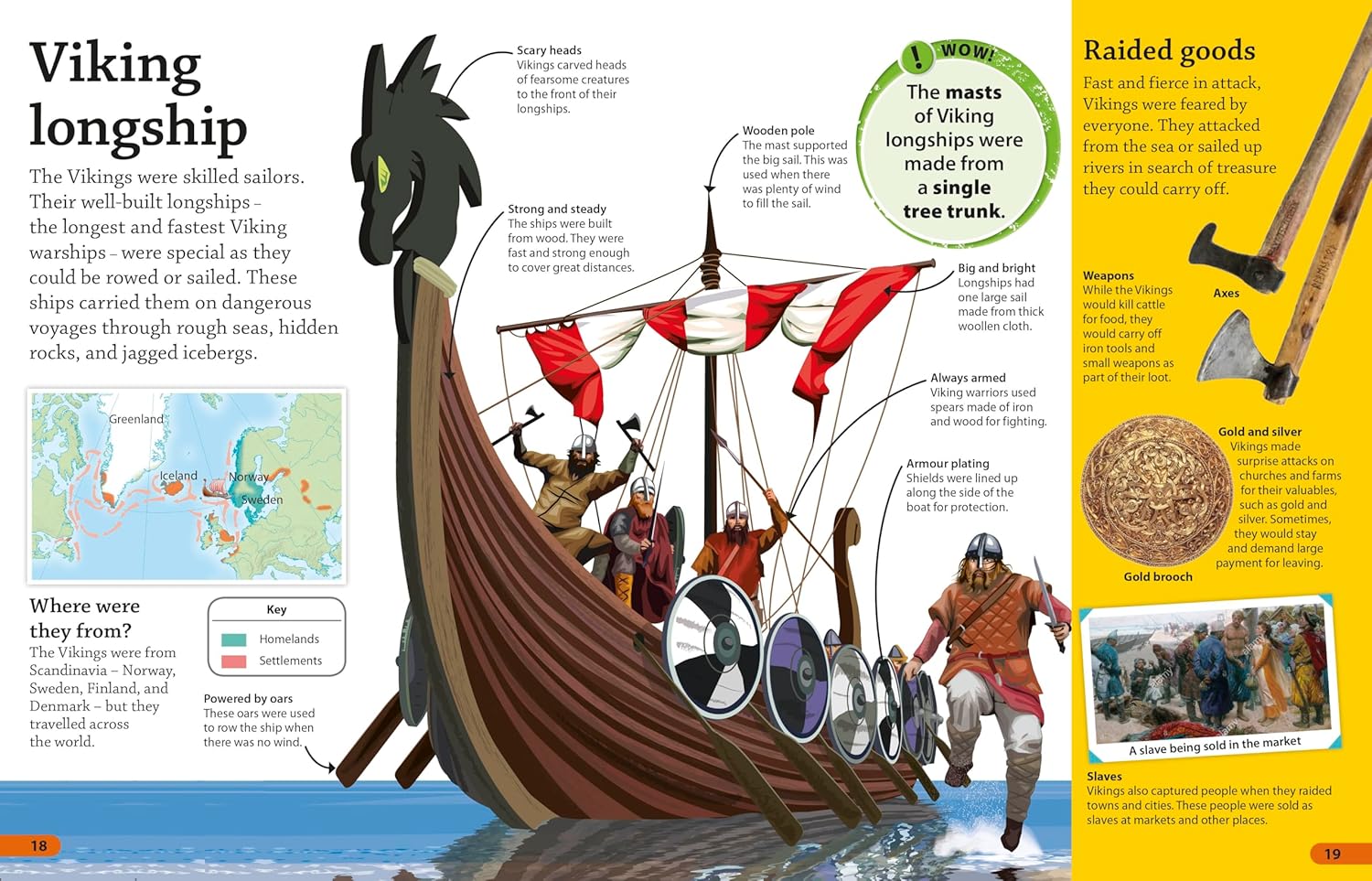 Find out all about the history of the Vikings, the warriors and explorers who raided Europe in their longships throughout the Middle Ages. Learn about Viking warfare, their families, homes, clothes, and crafts, as well as gods from Norse mythology, such as Thor and Loki, in this beautifully illustrated children's book that is crammed with amazing facts.