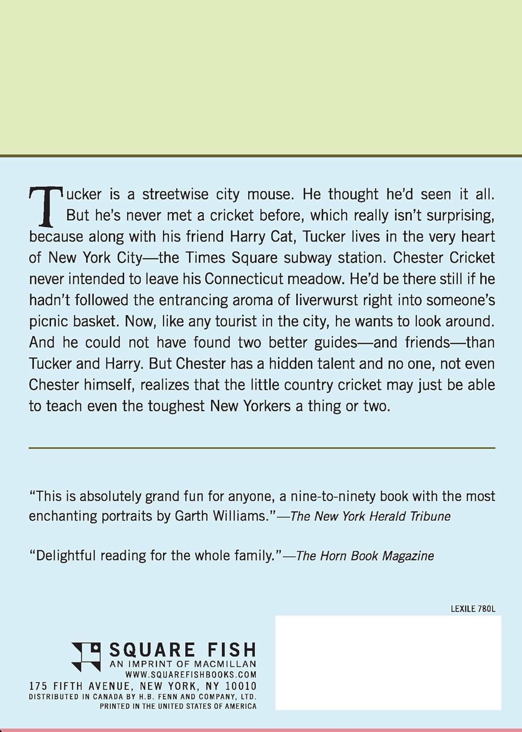 Chester makes a third friend, too. It is a boy, Mario, who rescues Chester from a dusty corner of the subway station and brings him to live in the safety of his parents' newsstand. He hopes at first to keep Chester as a pet, but Mario soon understands that the cricket is more than that. Because Chester has a hidden talent and no one--not even Chester himself--realizes that the little country cricket may just be able to teach even the toughest New Yorkers a thing or two.