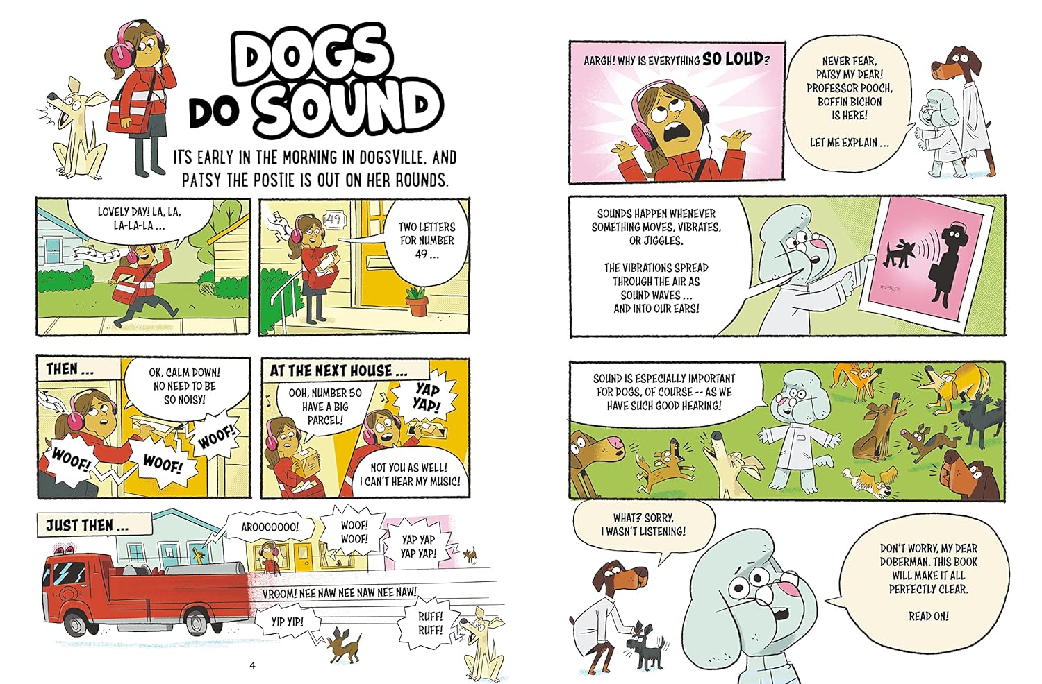 🔸 'Dogs Do Science' is a series of books that uses illustrations and humour to make learning more fun. It also contains dogs, lots of talking dogs. 'Sound' covers what feels like a little random choice of sound science. Most topics are covered in a two page full colour spread, often in the form of a cartoon.